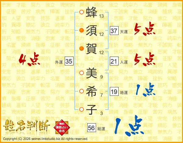 蜂(13画)須(12画)賀(12画) 美(9画)希(7画)子(3画)