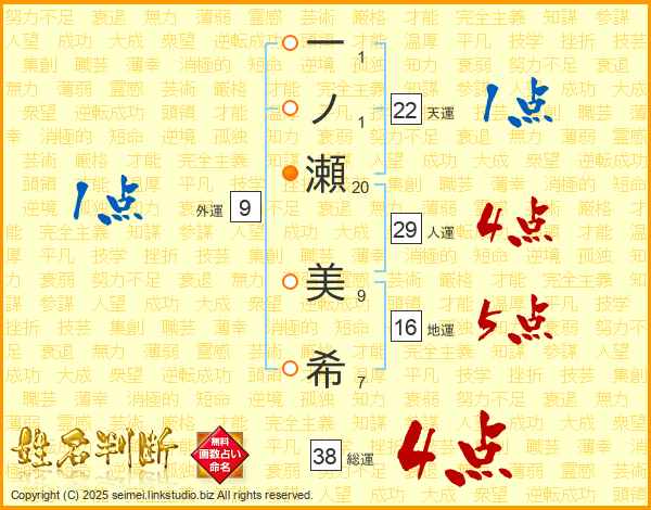 一(1画)ノ(1画)瀬(20画) 美(9画)希(7画)