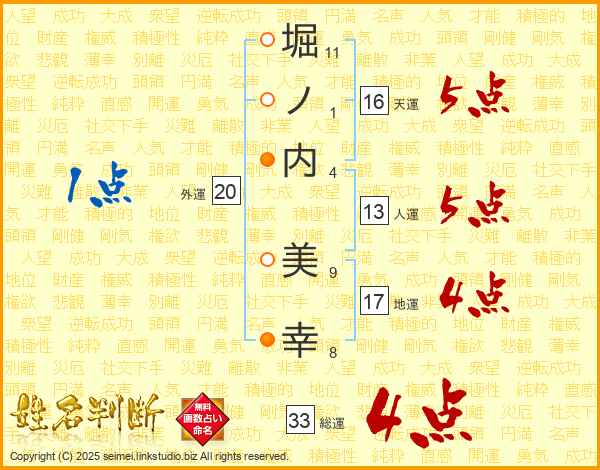 堀(11画)ノ(1画)内(4画) 美(9画)幸(8画)