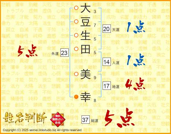 大(3画)豆(7画)生(5画)田(5画) 美(9画)幸(8画)