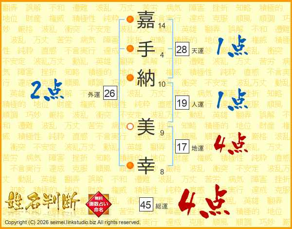 嘉(14画)手(4画)納(10画) 美(9画)幸(8画)