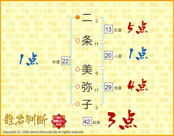 二(2画)条(11画) 美(9画)弥(17画)子(3画)