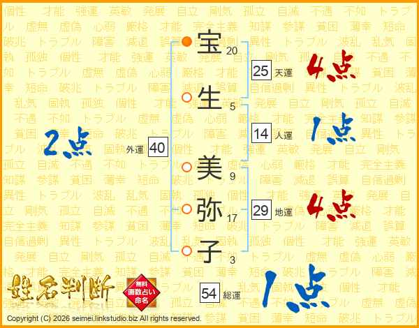 宝(20画)生(5画) 美(9画)弥(17画)子(3画)