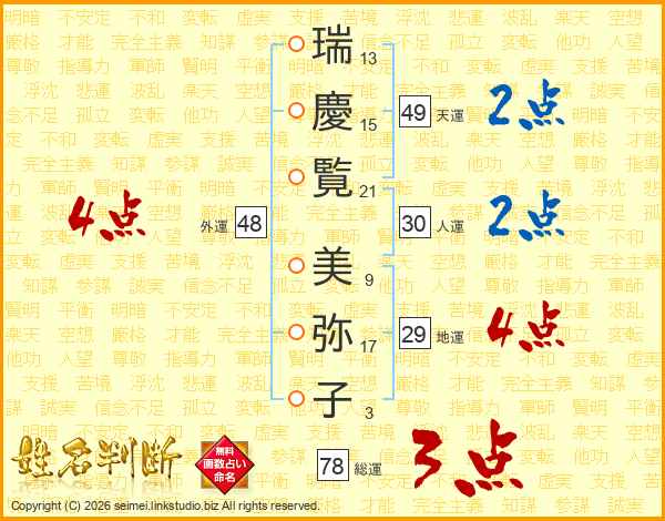 瑞(13画)慶(15画)覧(21画) 美(9画)弥(17画)子(3画)