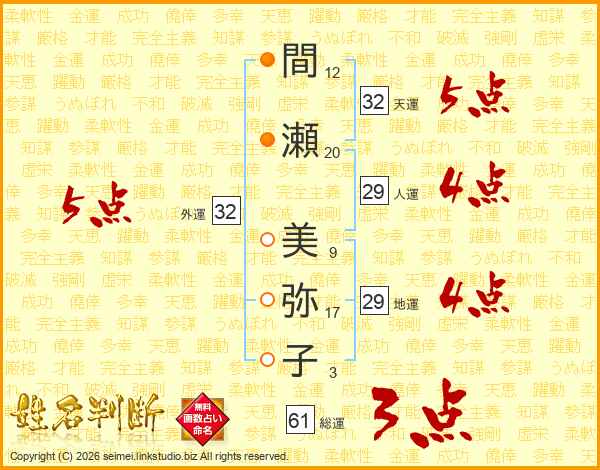 間(12画)瀬(20画) 美(9画)弥(17画)子(3画)