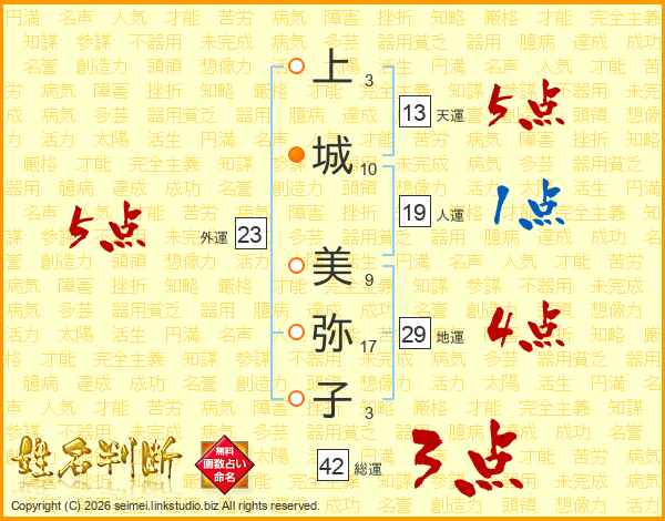 上(3画)城(10画) 美(9画)弥(17画)子(3画)