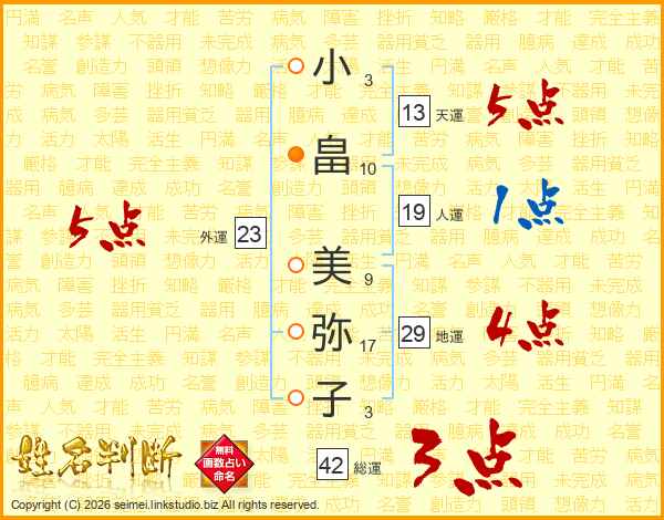 小(3画)畠(10画) 美(9画)弥(17画)子(3画)