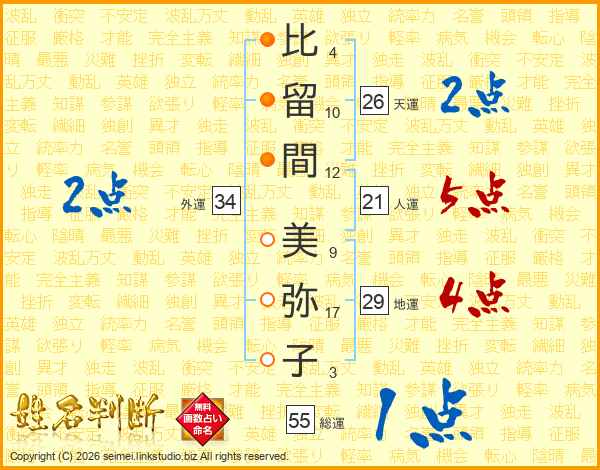 比(4画)留(10画)間(12画) 美(9画)弥(17画)子(3画)