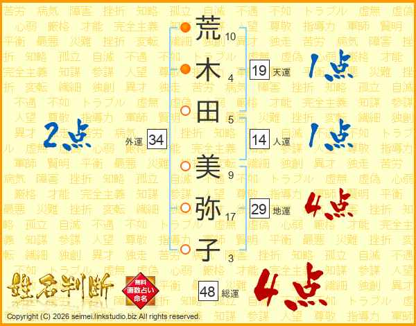 荒(10画)木(4画)田(5画) 美(9画)弥(17画)子(3画)