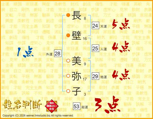 長(8画)壁(16画) 美(9画)弥(17画)子(3画)