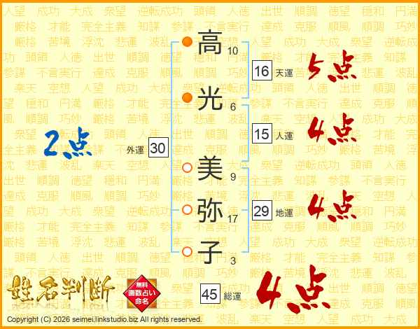 高(10画)光(6画) 美(9画)弥(17画)子(3画)