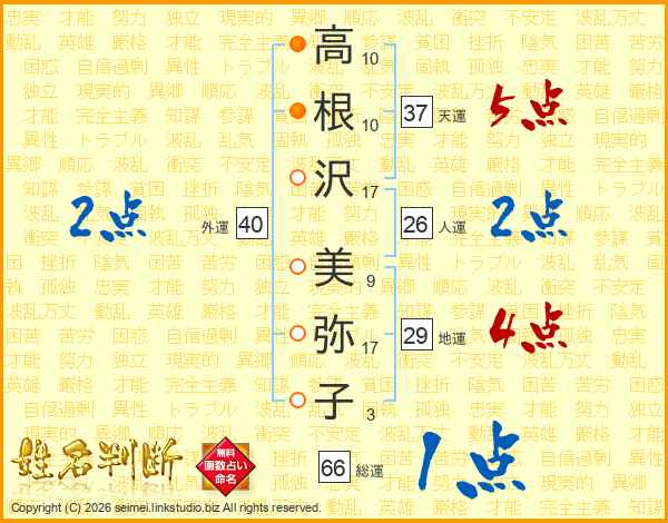 高根沢美弥子さんの総運は66画の1点!