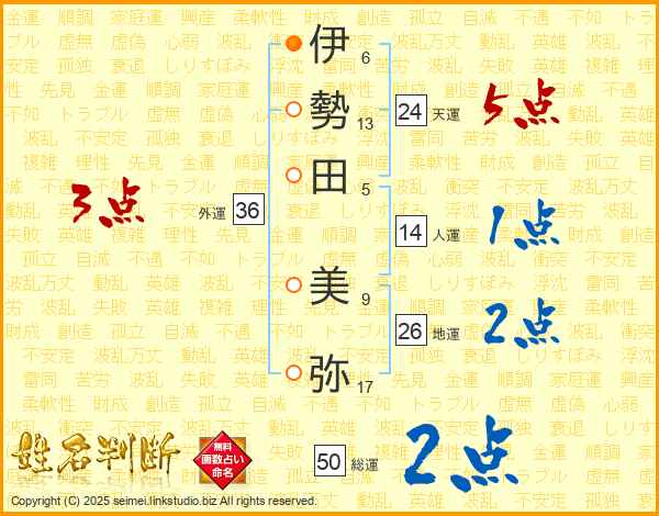 伊(6画)勢(13画)田(5画) 美(9画)弥(17画)