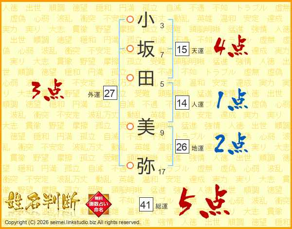 小(3画)坂(7画)田(5画) 美(9画)弥(17画)