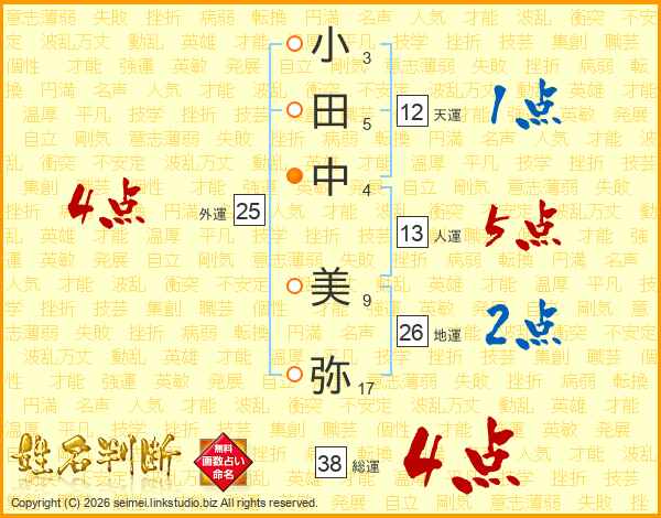 小(3画)田(5画)中(4画) 美(9画)弥(17画)