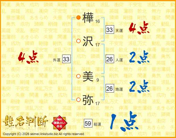 樺(16画)沢(17画) 美(9画)弥(17画)