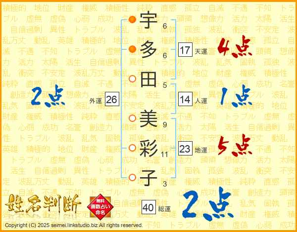 宇(6画)多(6画)田(5画) 美(9画)彩(11画)子(3画)