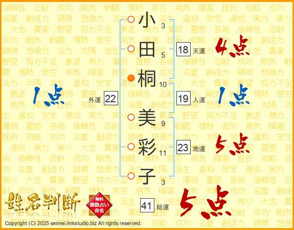 小(3画)田(5画)桐(10画) 美(9画)彩(11画)子(3画)