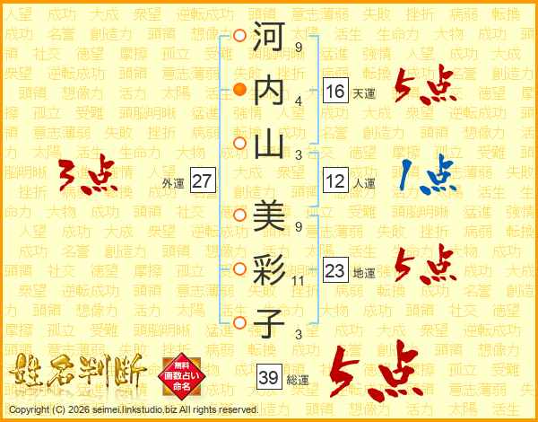 河(9画)内(4画)山(3画) 美(9画)彩(11画)子(3画)
