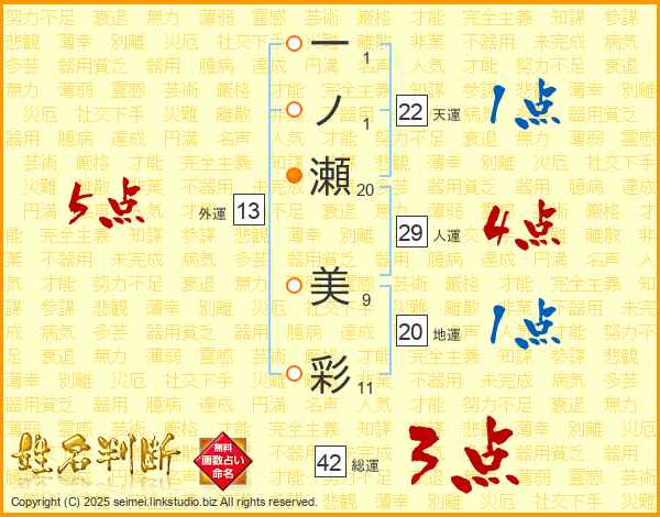 一(1画)ノ(1画)瀬(20画) 美(9画)彩(11画)