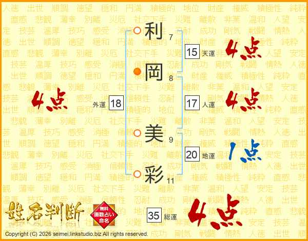 利(7画)岡(8画) 美(9画)彩(11画)