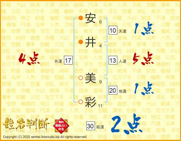 生活面を象徴する運勢です。外部から受ける影響力を表し、結婚運、家庭運や職場、環境への順応性を表します。総運から人運を引いた画数。姓や名が1文字の場合を除く。