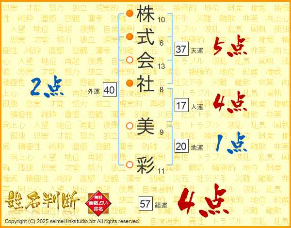 株(10画)式(6画)会(13画)社(8画) 美(9画)彩(11画)