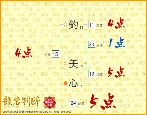 生活面を象徴する運勢です。外部から受ける影響力を表し、結婚運、家庭運や職場、環境への順応性を表します。総運から人運を引いた画数。姓や名が1文字の場合を除く。