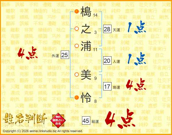 槝(14画)之(3画)浦(11画) 美(9画)怜(8画)