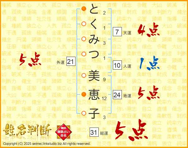 と(2画)く(1画)み(3画)つ(1画) 美(9画)恵(12画)子(3画)