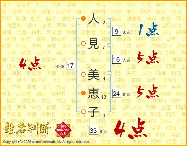 人(2画)見(7画) 美(9画)恵(12画)子(3画)