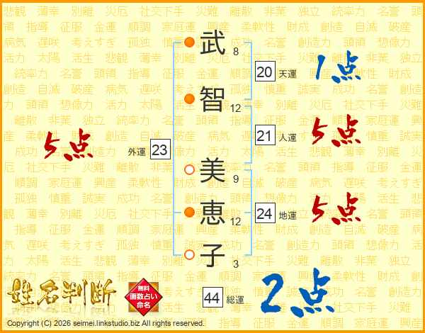 武(8画)智(12画) 美(9画)恵(12画)子(3画)