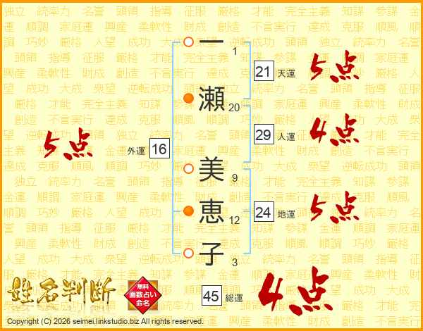 一(1画)瀬(20画) 美(9画)恵(12画)子(3画)