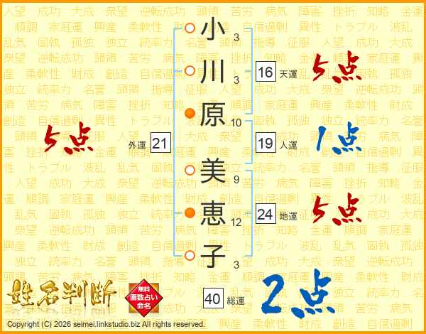 小(3画)川(3画)原(10画) 美(9画)恵(12画)子(3画)