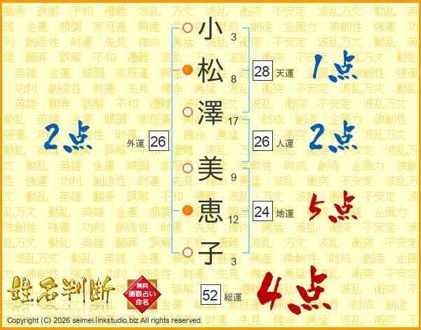 小(3画)松(8画)澤(17画) 美(9画)恵(12画)子(3画)