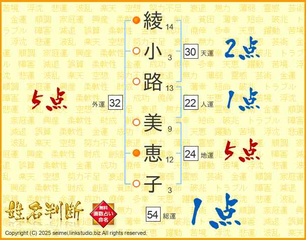 綾(14画)小(3画)路(13画) 美(9画)恵(12画)子(3画)