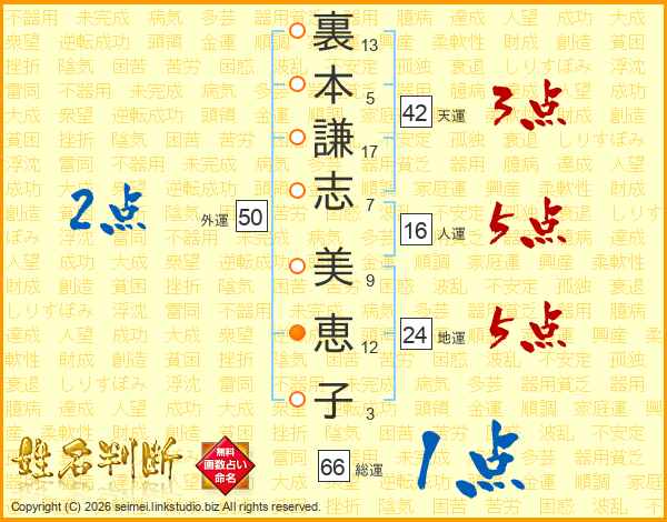 裏本謙志美恵子さんの総運は66画の1点!