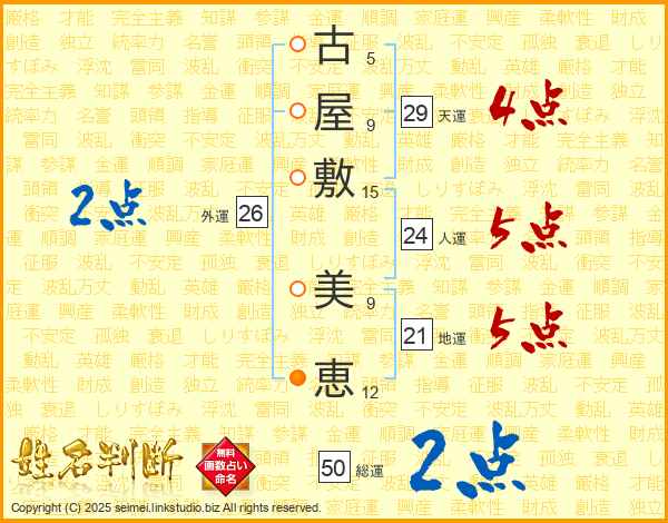 古(5画)屋(9画)敷(15画) 美(9画)恵(12画)