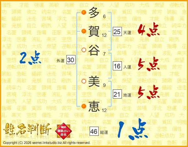 多(6画)賀(12画)谷(7画) 美(9画)恵(12画)