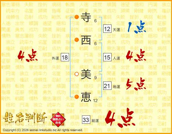 寺(6画)西(6画) 美(9画)恵(12画)