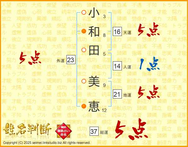 小(3画)和(8画)田(5画) 美(9画)恵(12画)