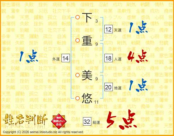 生活面を象徴する運勢です。外部から受ける影響力を表し、結婚運、家庭運や職場、環境への順応性を表します。総運から人運を引いた画数。姓や名が1文字の場合を除く。