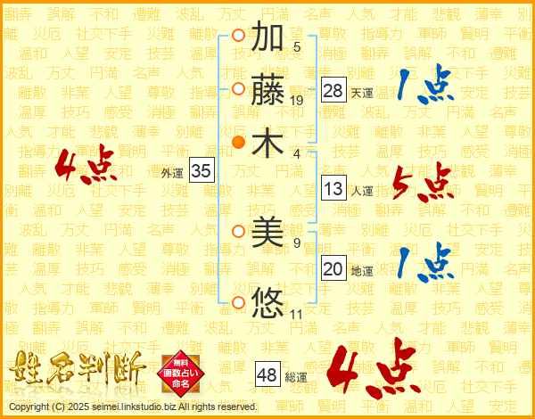 加(5画)藤(19画)木(4画) 美(9画)悠(11画)