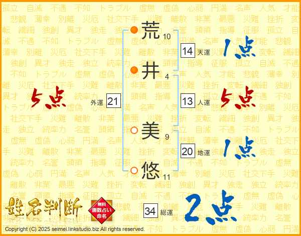 荒(10画)井(4画) 美(9画)悠(11画)