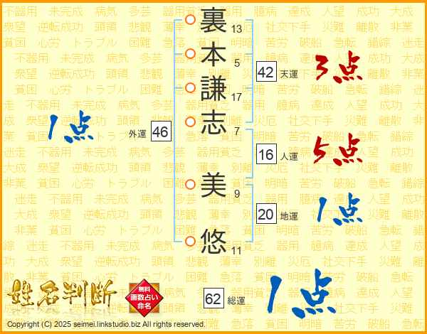 裏(13画)本(5画)謙(17画)志(7画) 美(9画)悠(11画)