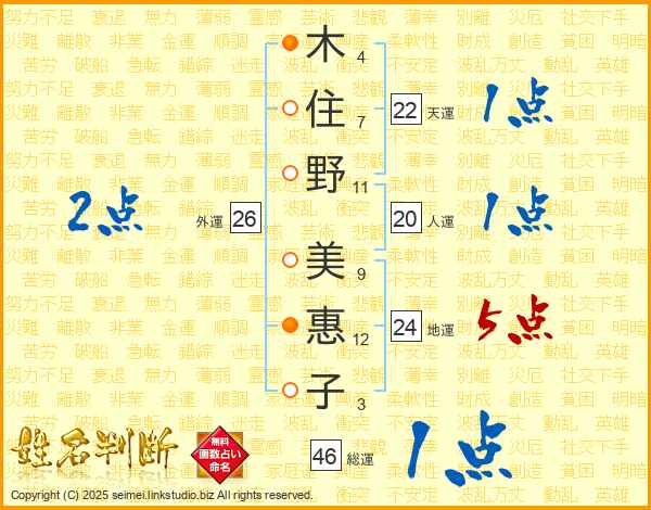 木(4画)住(7画)野(11画) 美(9画)惠(12画)子(3画)