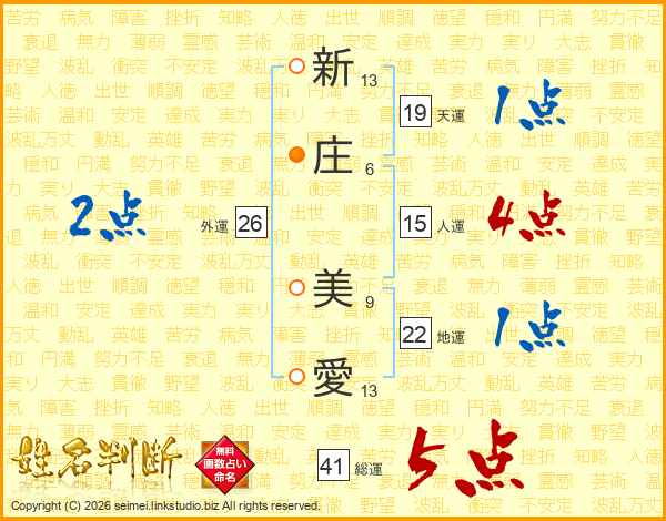 生活面を象徴する運勢です。外部から受ける影響力を表し、結婚運、家庭運や職場、環境への順応性を表します。総運から人運を引いた画数。姓や名が1文字の場合を除く。
