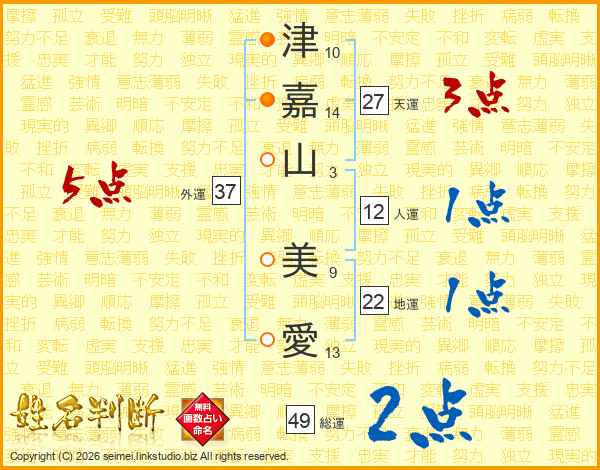 津(10画)嘉(14画)山(3画) 美(9画)愛(13画)