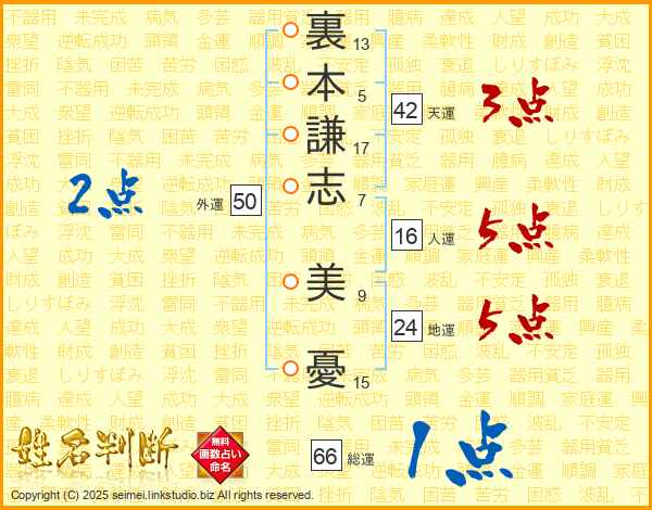 裏(13画)本(5画)謙(17画)志(7画) 美(9画)憂(15画)