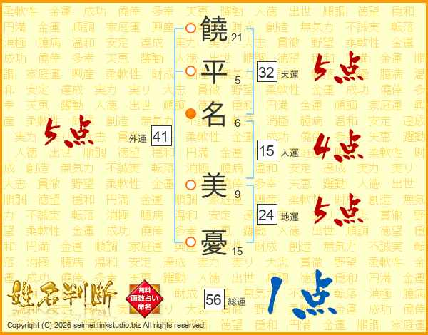 饒(21画)平(5画)名(6画) 美(9画)憂(15画)